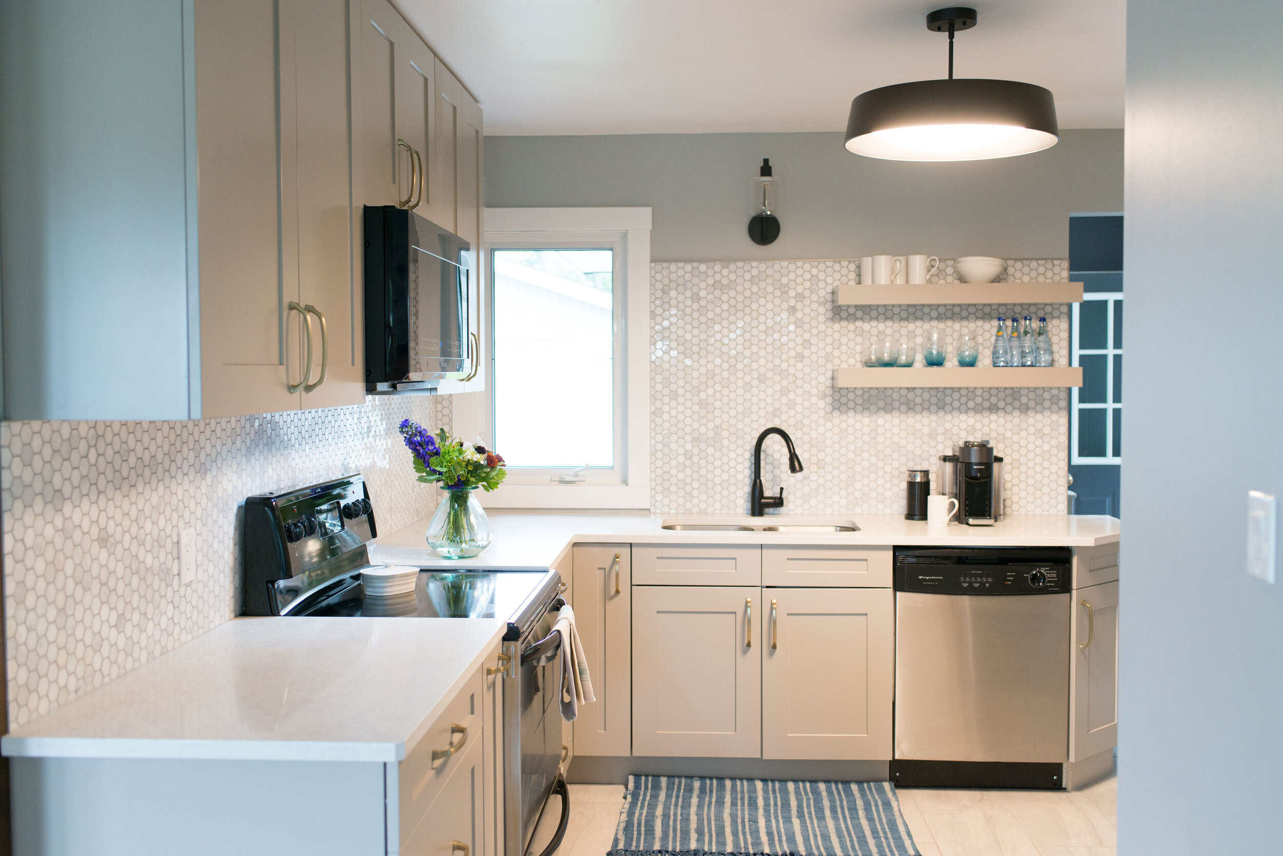 In this kitchen the window is located in the corner of the kitchen, which is where the sink used to be. Generally a window over a sink is the most common however a corner sink eats up a lot of cabinet space, so we reconfigured that area put the sink on the north wall and installed open shelving instead of cabinets for more of a feature in the kitchen. This is where we added wall sconces, and a hexagon mosaic tile 2/3’s of the way up the wall to accommodate the open shelving placement.